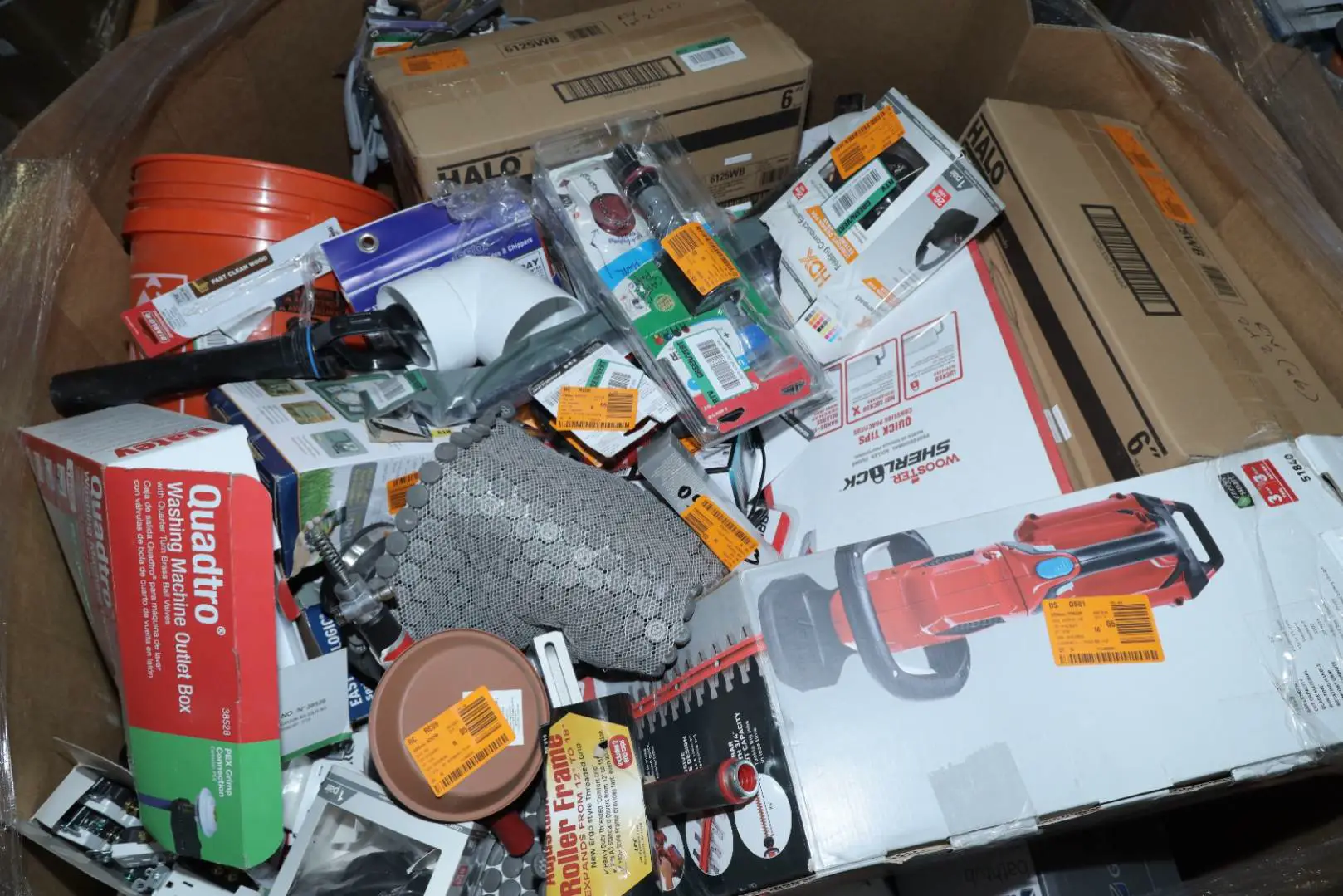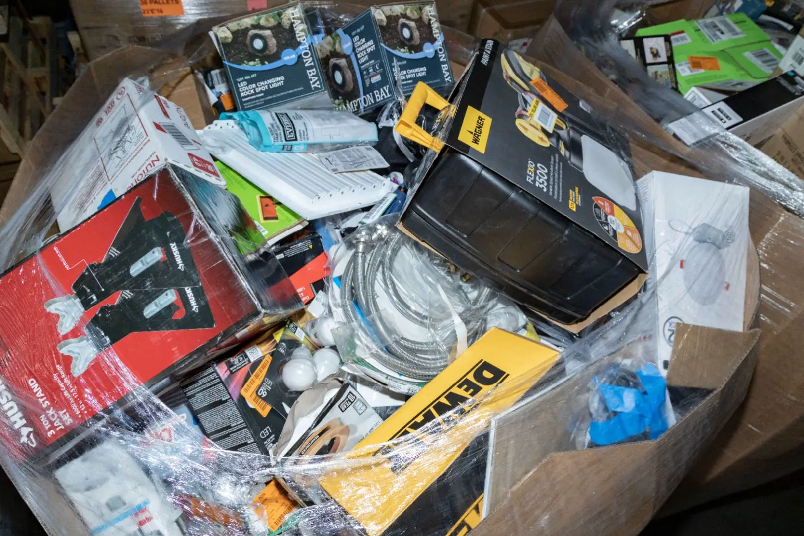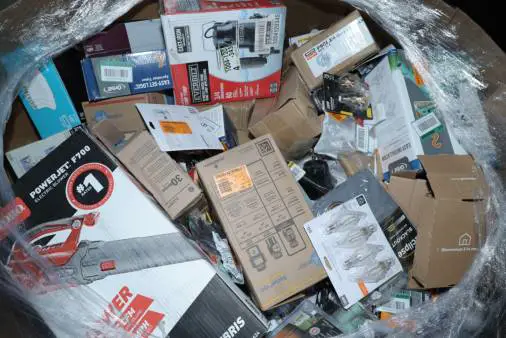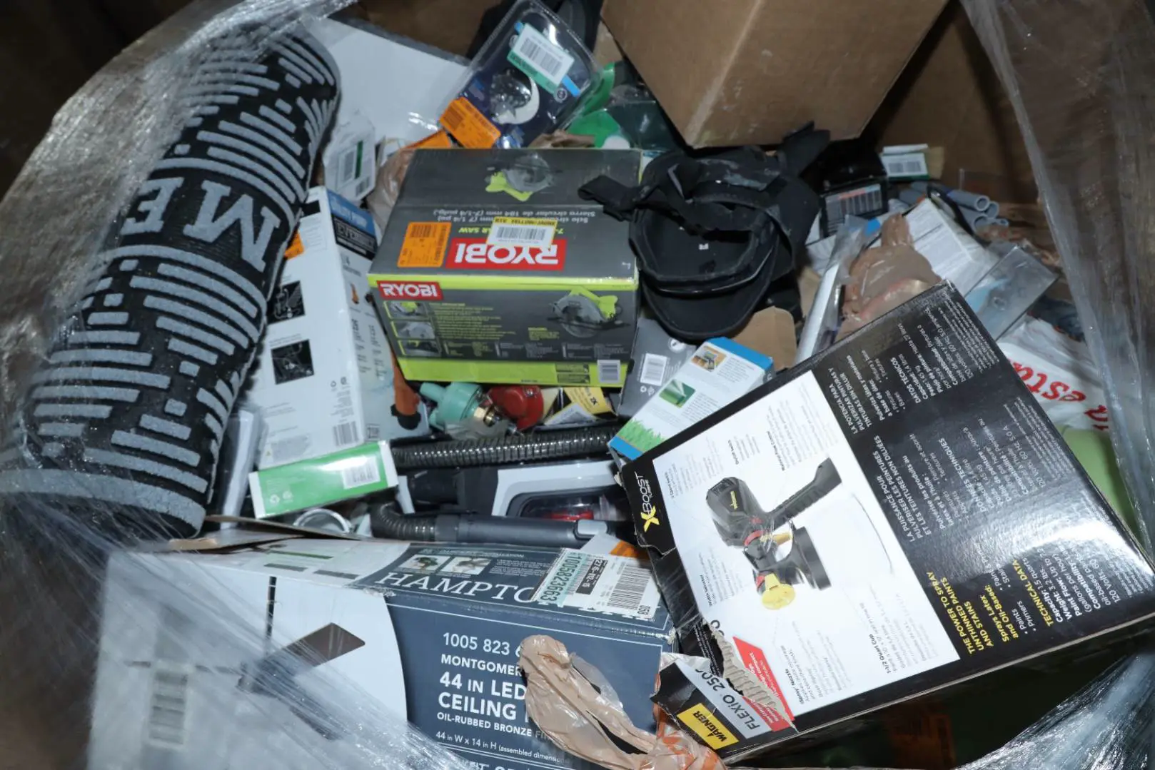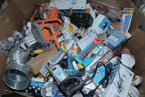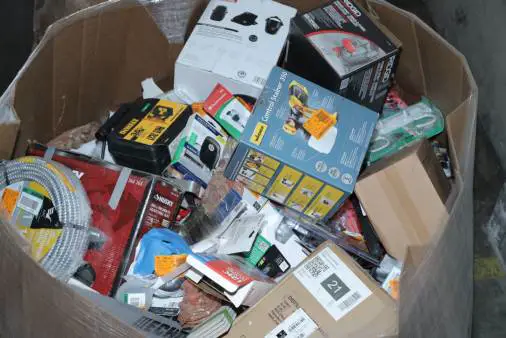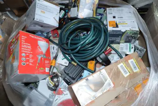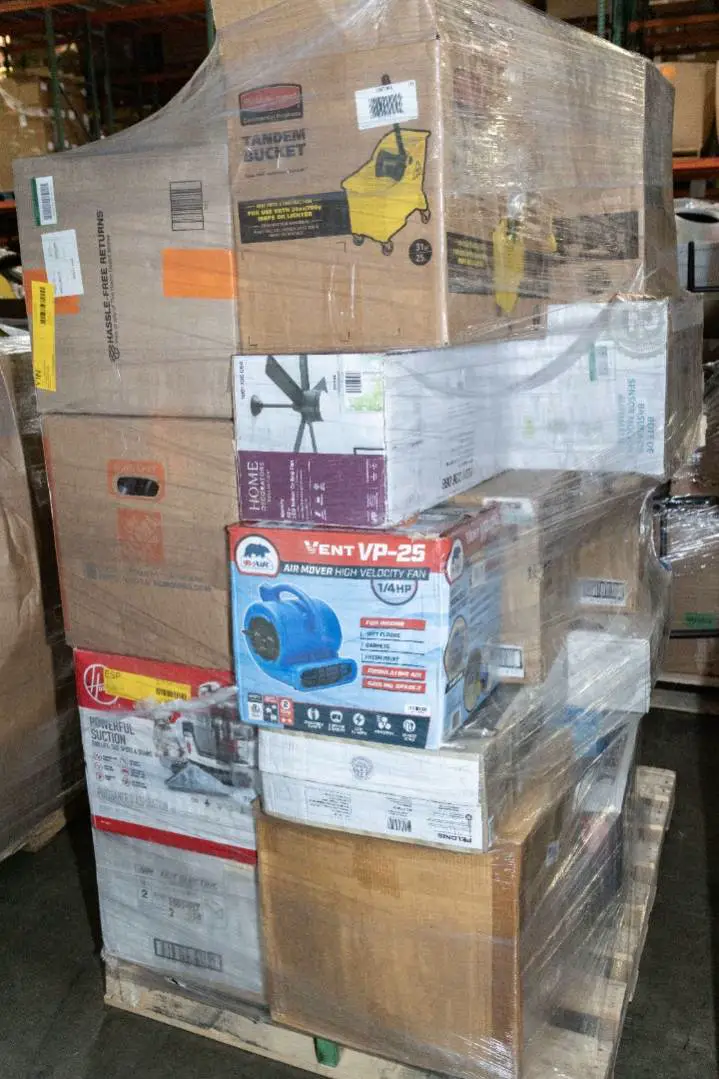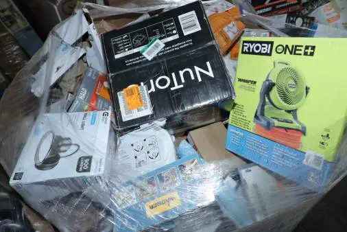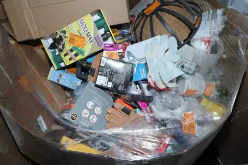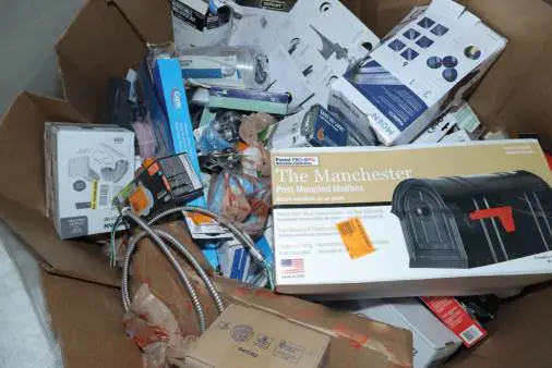 Items typically found may include but are not limited to: Shower heads, Wet/Dry Vacuum, Heater Fan, Mower, Range Hood, measuring tape, Locks, Sprayer, Welding Helmet, Hammer, Scales, Security Light, Vents, Boots, Night Light, Paint kits, Toilet paper, Ceiling Fans, Fans, Bins, Patio Furniture, Lighting, Tool Cabinets, Leaf Blowers, Flooring, Shelving, Tool Chest, Faucets, Reciprocating Saws, Hose, Storage Units, Water Filters, Air Filters, Door Handles, Fire Pits, Mail Box, and more…