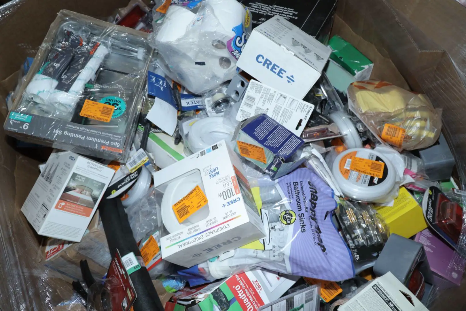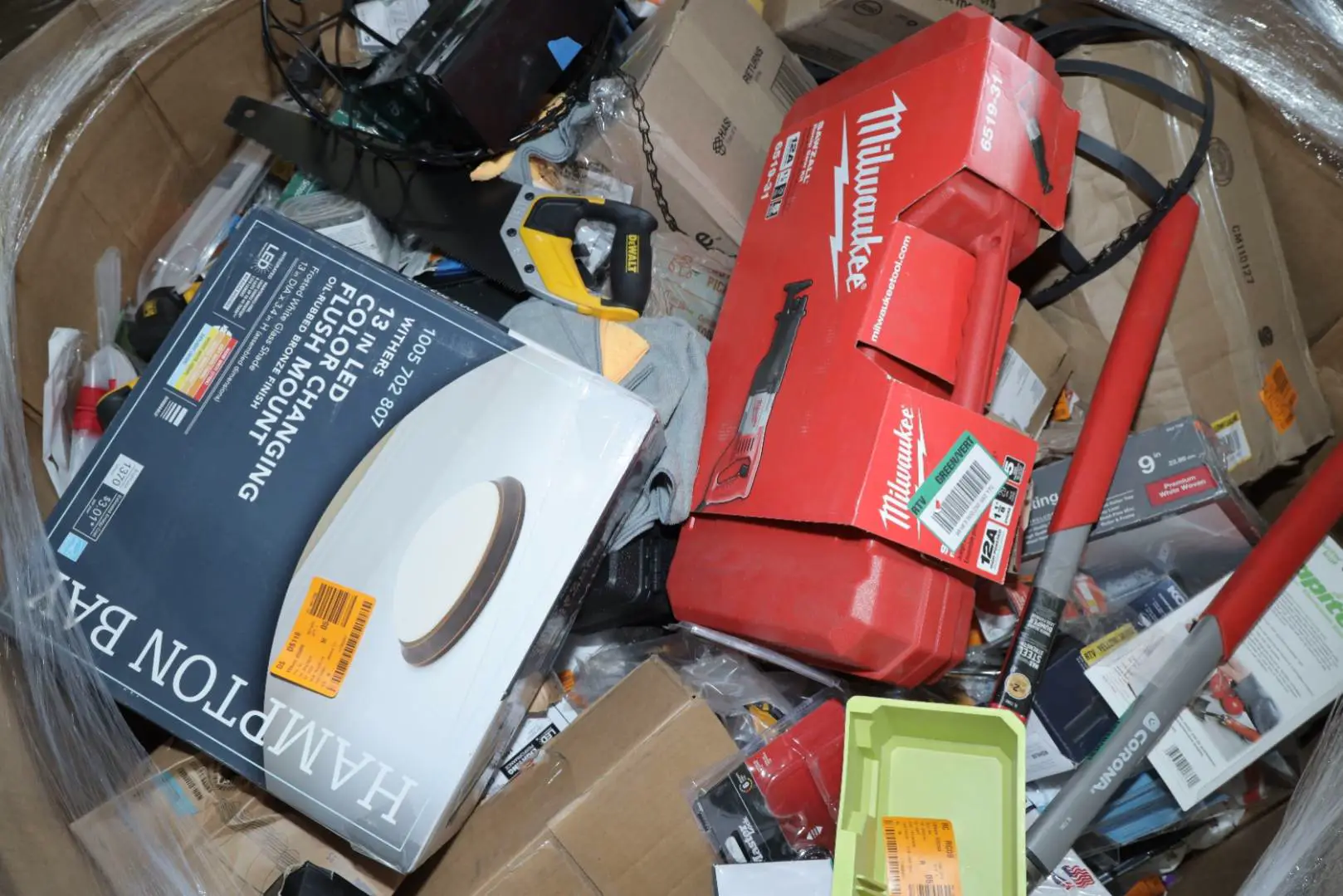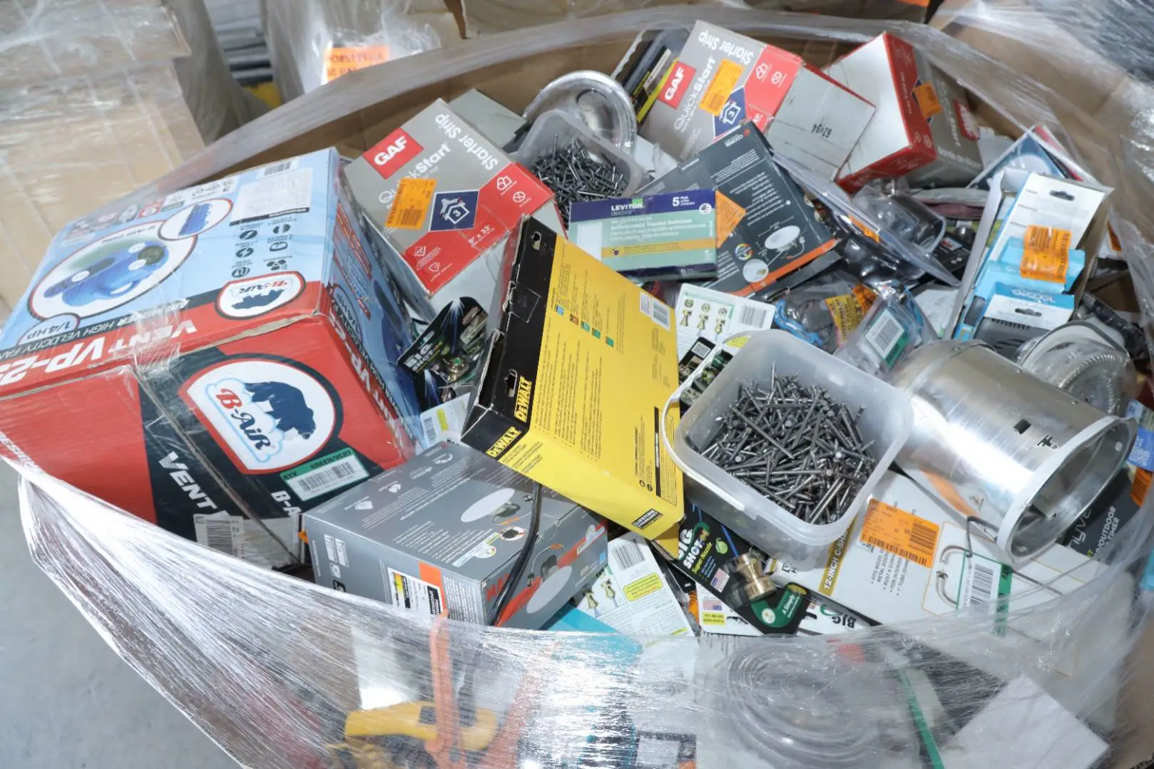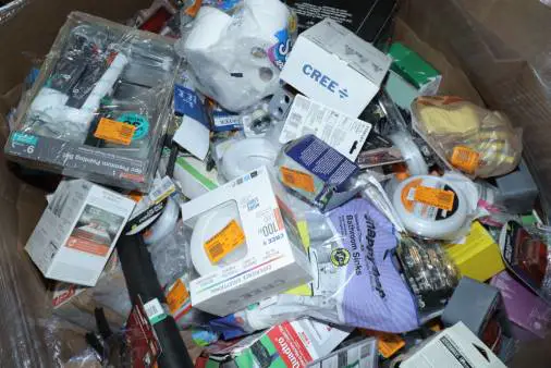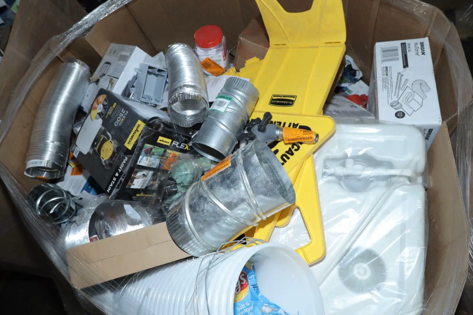 Items typically found may include but are not limited to: Shower heads, Wet/Dry Vacuum, Heater Fan, Mower, Range Hood, measuring tape, Locks, Sprayer, Welding Helmet, Hammer, Scales, Security Light, Vents, Boots, Night Light, Paint kits, Toilet paper, Ceiling Fans, Fans, Bins, Patio Furniture, Lighting, Tool Cabinets, Leaf Blowers, Flooring, Shelving, Tool Chest, Faucets, Reciprocating Saws, Hose, Storage Units, Water Filters, Air Filters, Door Handles, Fire Pits, Mail Box, and more…