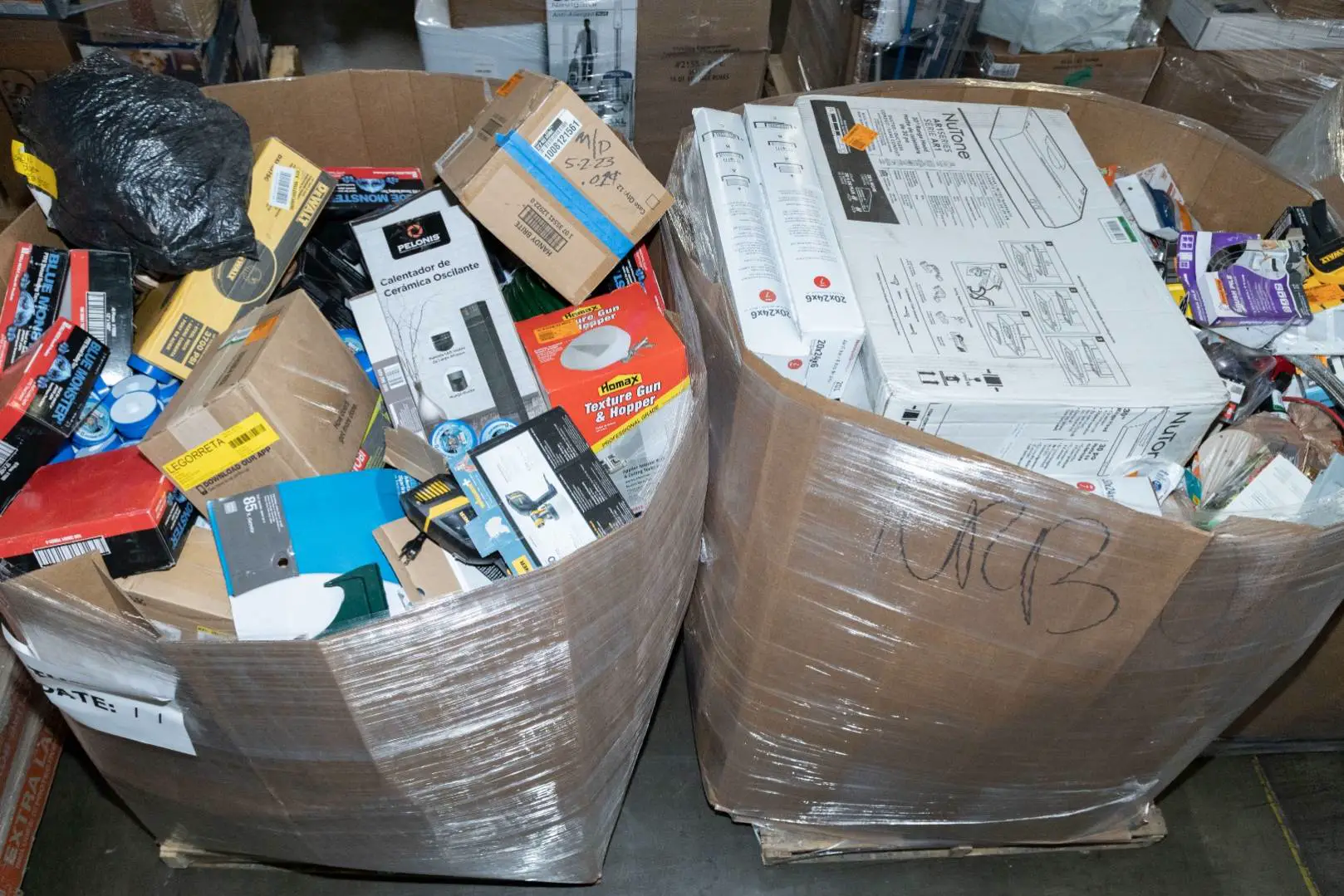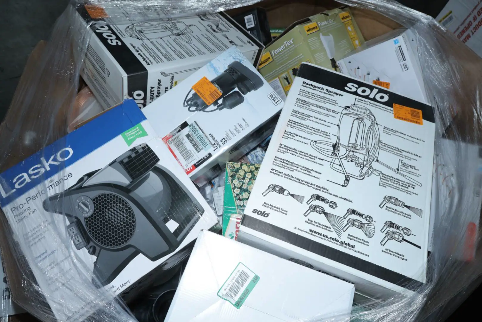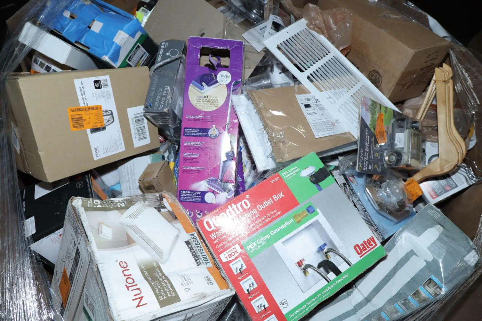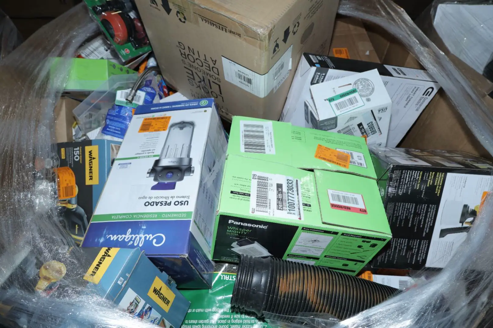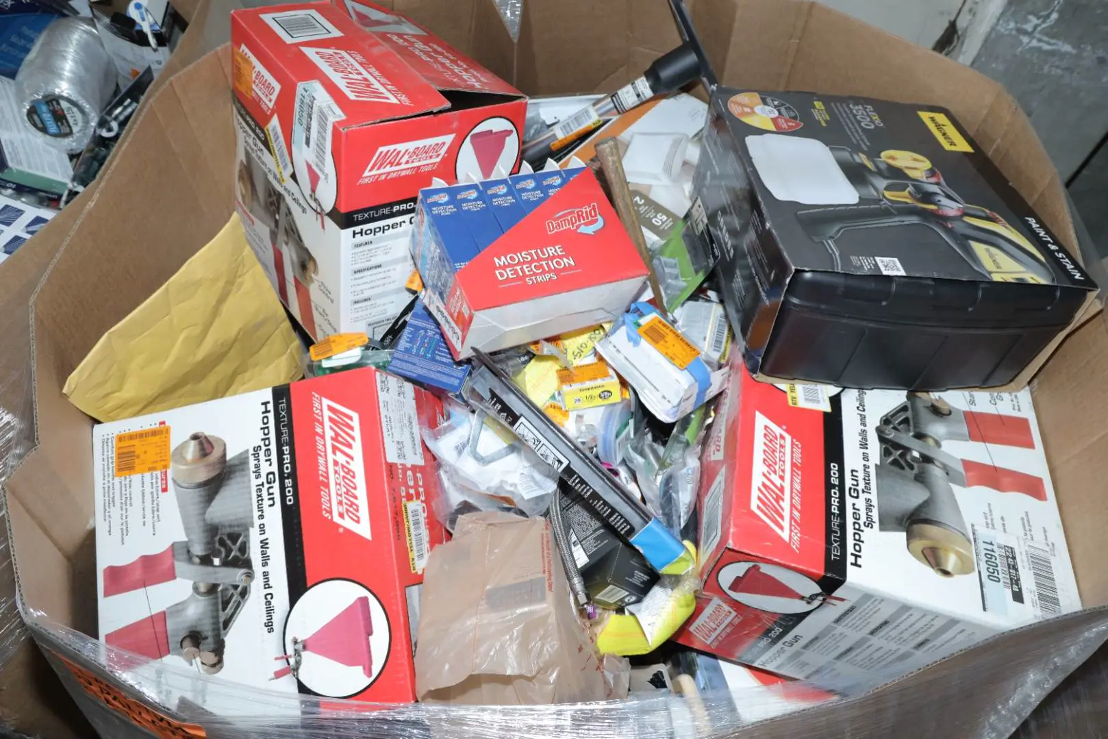 Items typically found may include but are not limited to: Shower heads, Wet/Dry Vacuum, Heater Fan, Mower, Range Hood, measuring tape, Locks, Sprayer, Welding Helmet, Hammer, Scales, Security Light, Vents, Boots, Night Light, Paint kits, Toilet paper, Ceiling Fans, Fans, Bins, Patio Furniture, Lighting, Tool Cabinets, Leaf Blowers, Flooring, Shelving, Tool Chest, Faucets, Reciprocating Saws, Hose, Storage Units, Water Filters, Air Filters, Door Handles, Fire Pits, Mail Box, and more…
